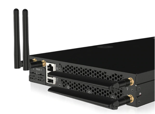 La siguiente figura muestra la parte posterior del servidor SE350 cuando el módulo de red inalámbrico está instalado. Los servidores con módulos de red cableados son los mismos excepto que se han quitado las antenas.